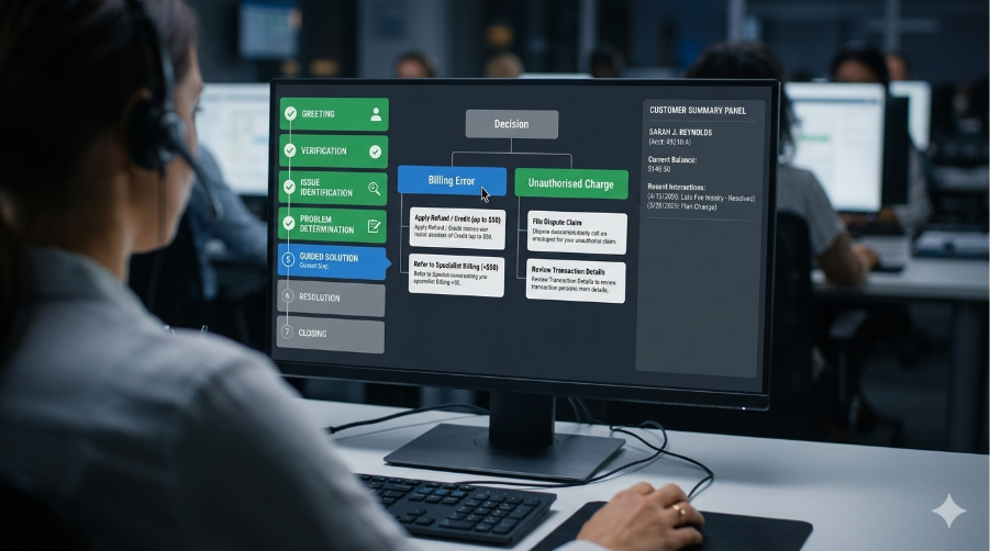 Complex troubleshooting without structural support is the most operationally costly problem. The troubleshooting stage is where the greatest cognitive demand is placed on agents — and where call flows most commonly break down. Agents facing a complex billing dispute, a technical fault, or a sensitive complaint while simultaneously navigating a CRM, listening to the customer, and trying to recall the correct procedure are operating at the limit of their cognitive capacity. Without a structured decision framework, mistakes happen, steps are missed, and customers receive incomplete resolutions that generate repeat contacts.