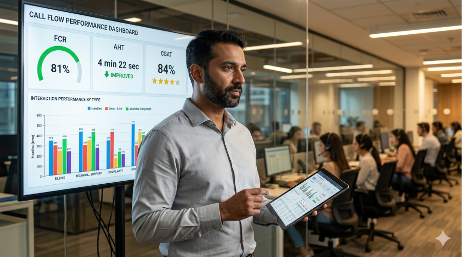 Customer Satisfaction Score (CSAT) measures how the overall interaction felt to the customer. Post-call CSAT data, when linked to specific call flow stages and interaction types, identifies which parts of the designed flow are producing poor experiences — and provides the evidence base for targeted improvements.